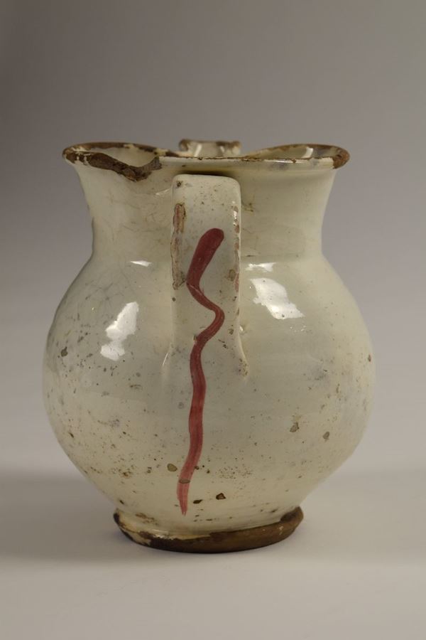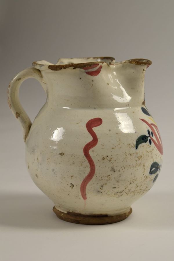 Brocca in maiolica dipinta a bocca trilobata evidenziata da gocce rosa, corpo decorato da grande fiore nei colori del rosa, giallo e verde.