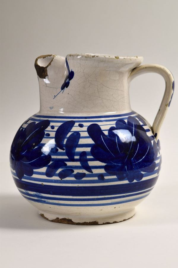 Brocca in maiolica policroma a bocca trilobata evidenziata da fiori, corpo decorato a motivi floreali e righe orizzontali nei toni del blu.