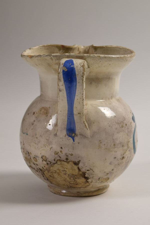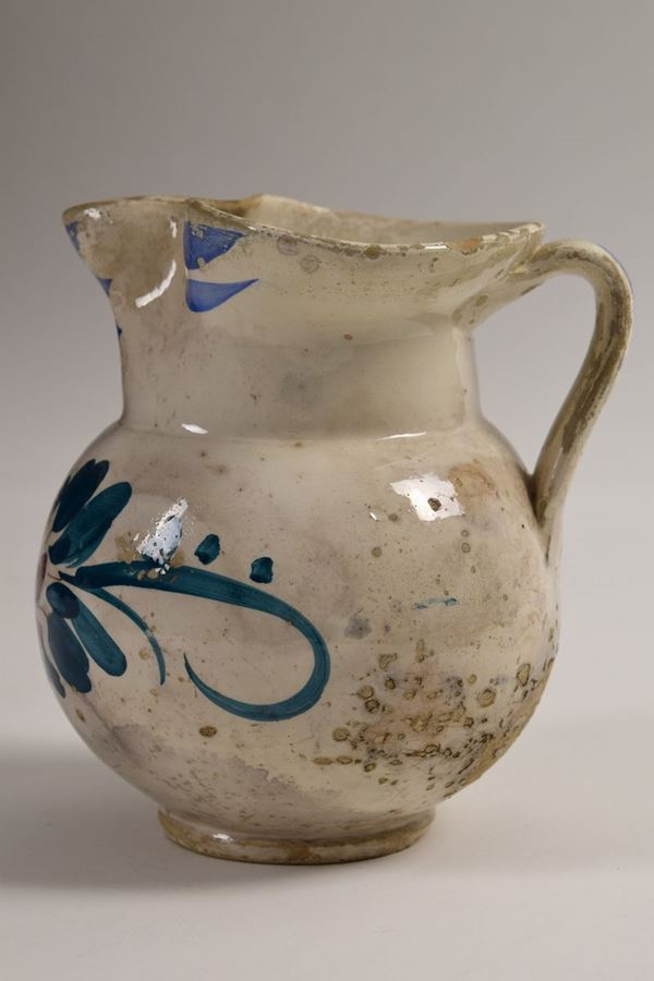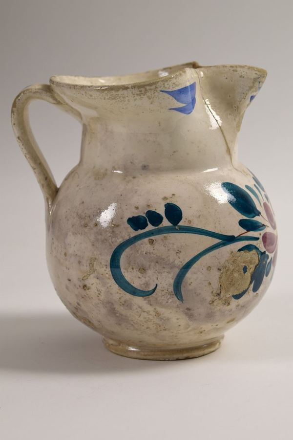 Brocca in maiolica policroma a bocca trilobata evidenziata da pennellate di colore blu, corpo decorato con grande fiore centrale e fogliame nei colori bruno, melanzana e verde.