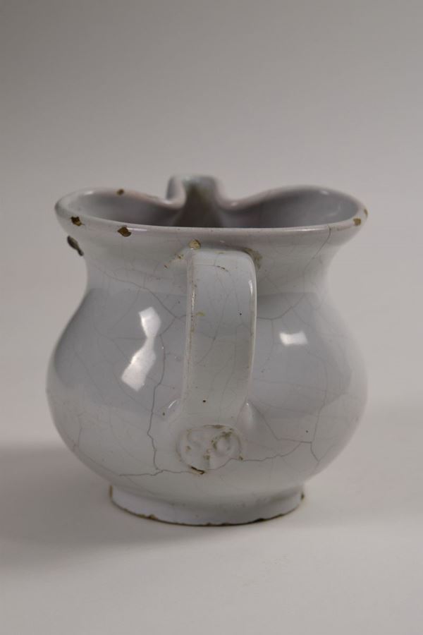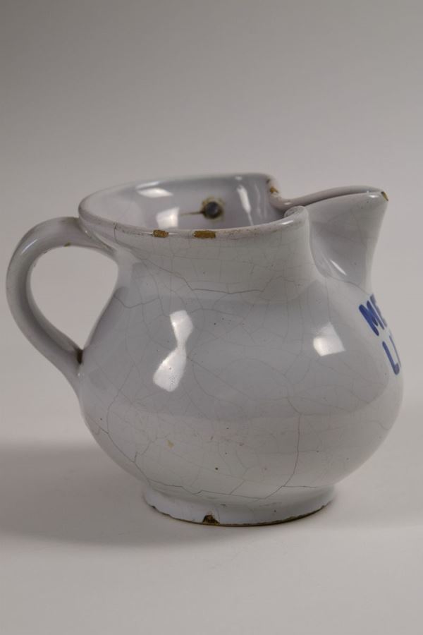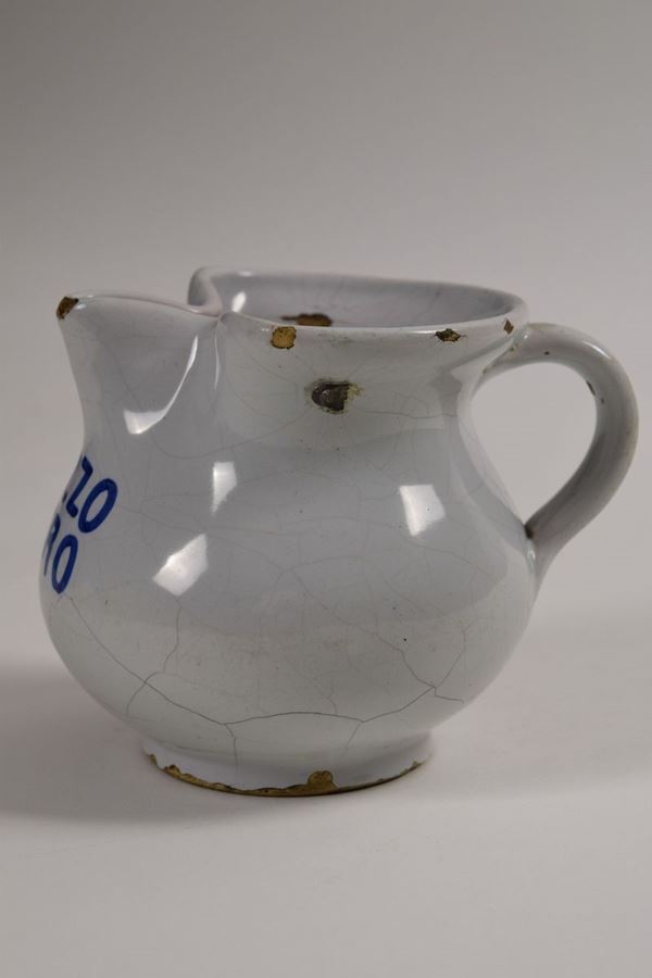 Brocca in maiolica smaltata ed invetriata a bocca trilobata con scritta al centro "mezzo litro", provvista di piombino annonario.