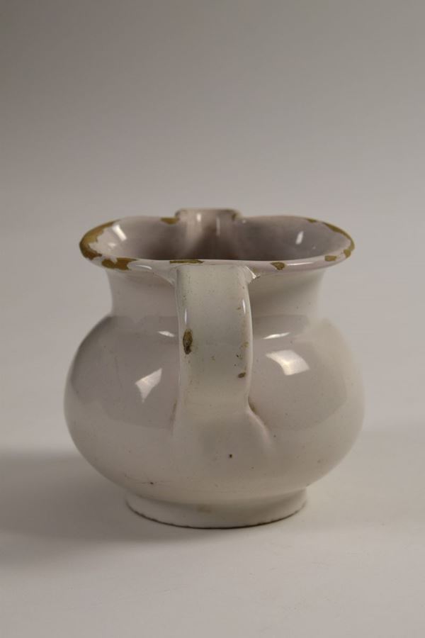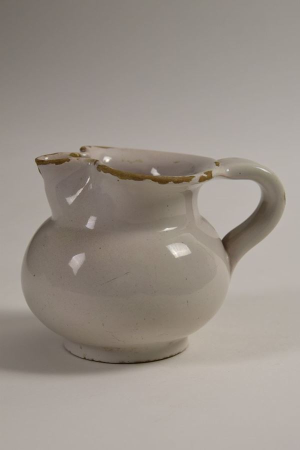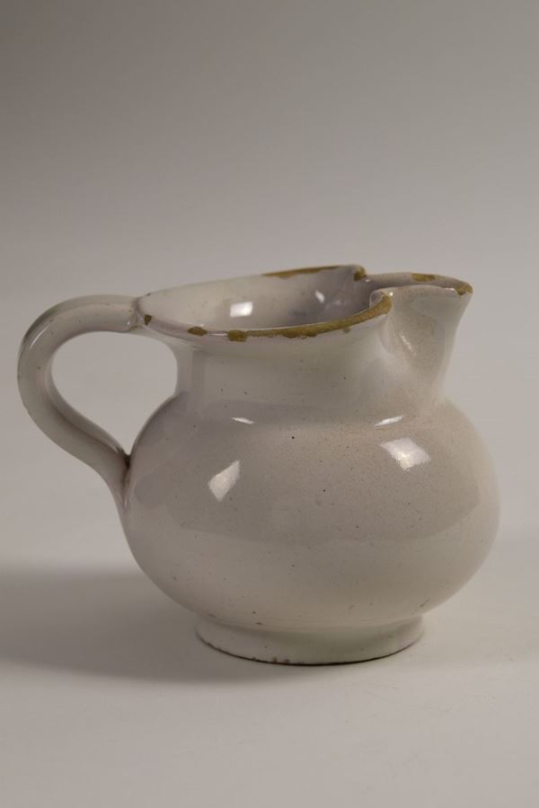 Piccola brocca in ceramica smaltata bianca a bocca trilobata.