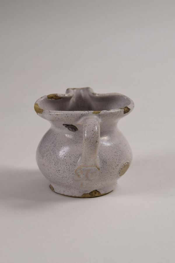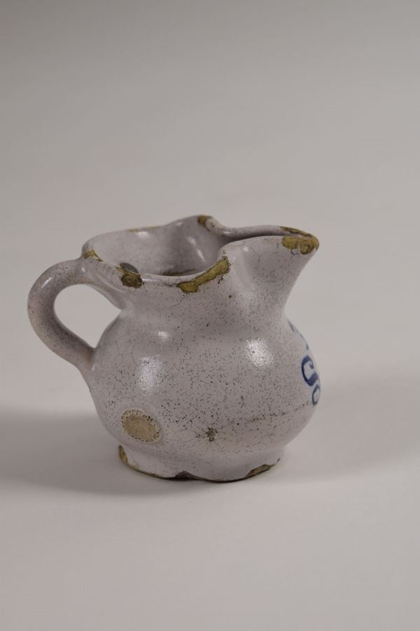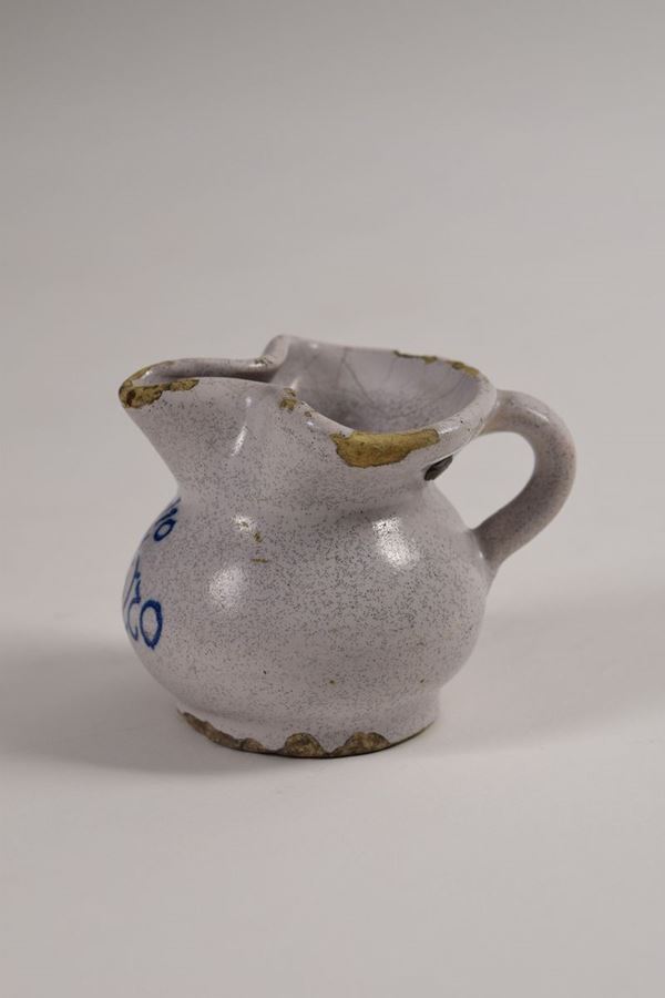 Piccola brocca in maiolica smaltata ed invetriata in bianco, bocca trilobata, al centro scritta in blu "1/10 di litro". Presenta piombino annonario.