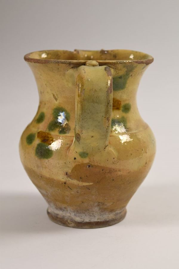 Piccola brocca in ceramica smaltata e decorata a piccoli fiori verdi e bruni su fondo giallo e bocca trilobata.