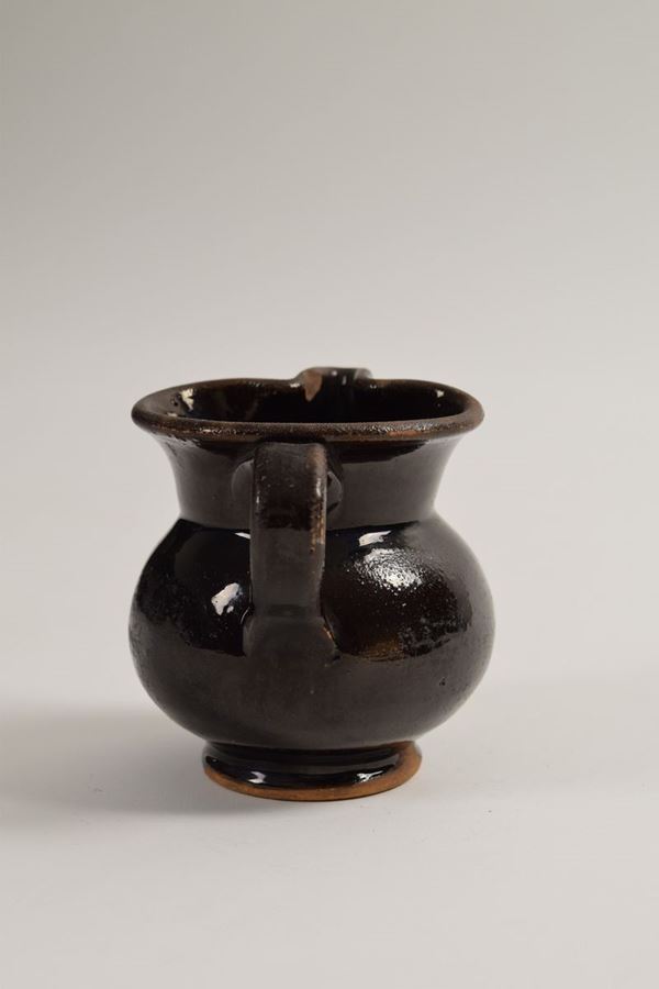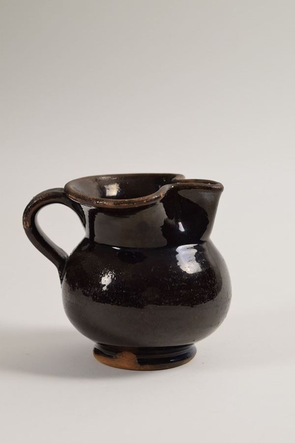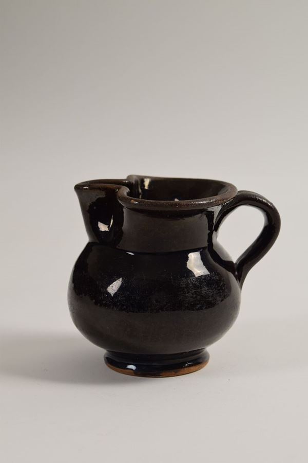 Piccola brocca in terracotta monocroma smaltate ed invetriata di color marrone scuro.