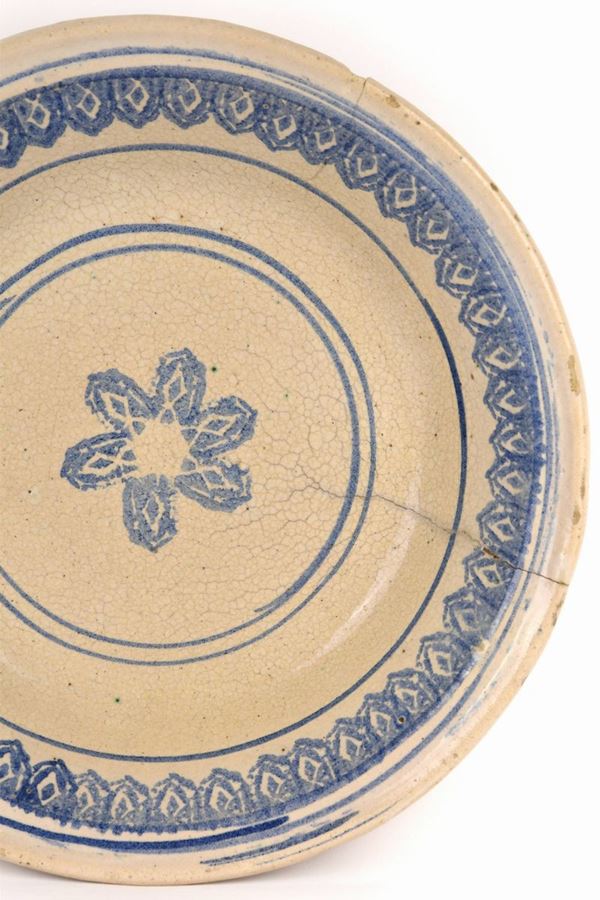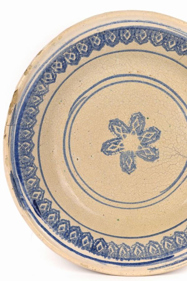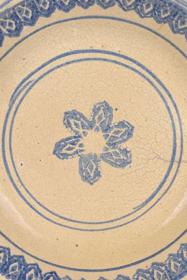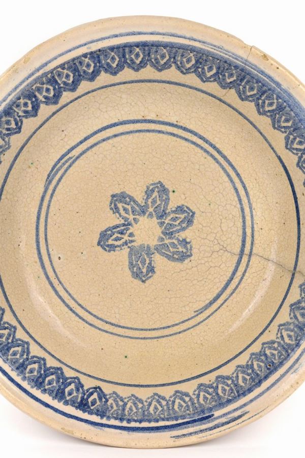 Catino in maiolica policroma decorata con fiori al centro e decori blu a "stampino" lungo il bordo.
