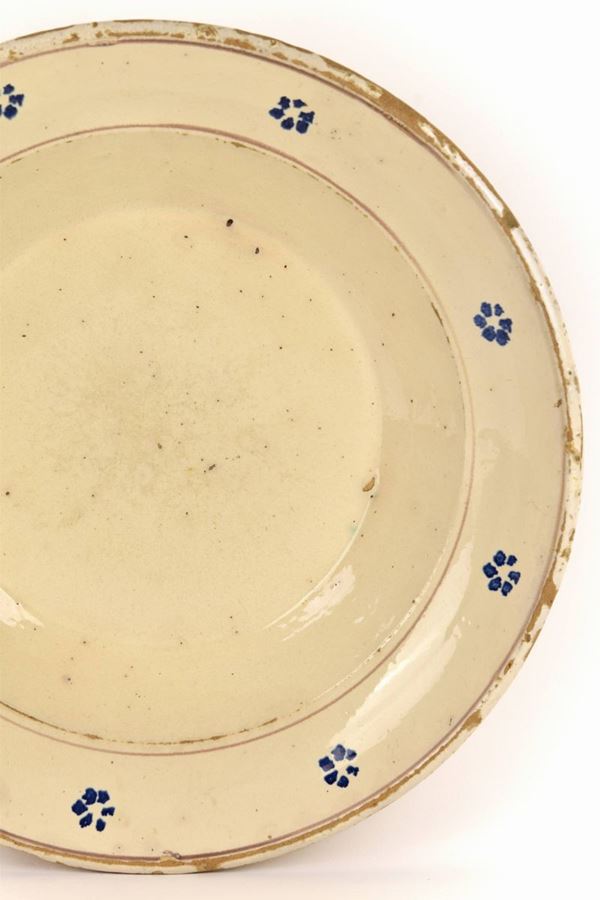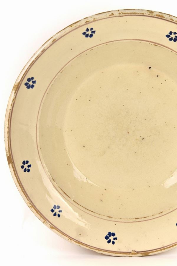 Catino in maiolica smaltata decorato nel bordo con fiori a "spugna" e righe di colore bruno.