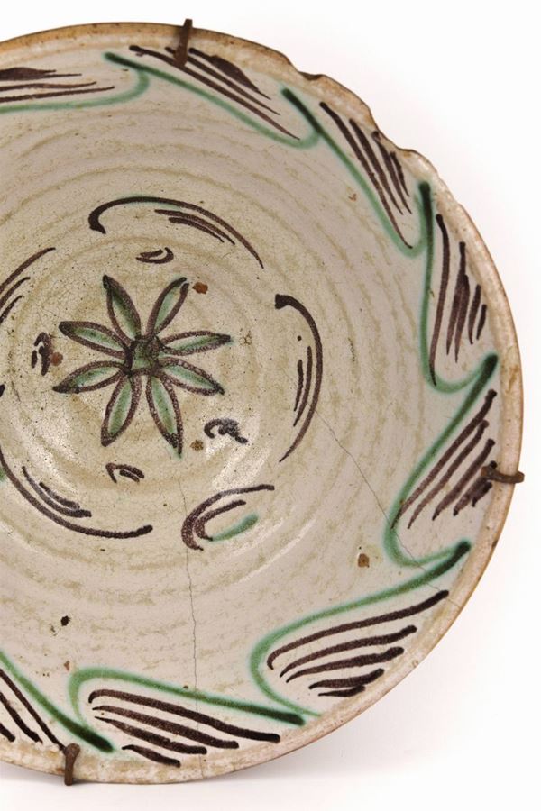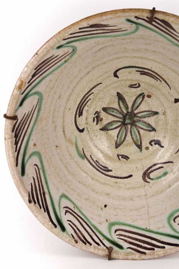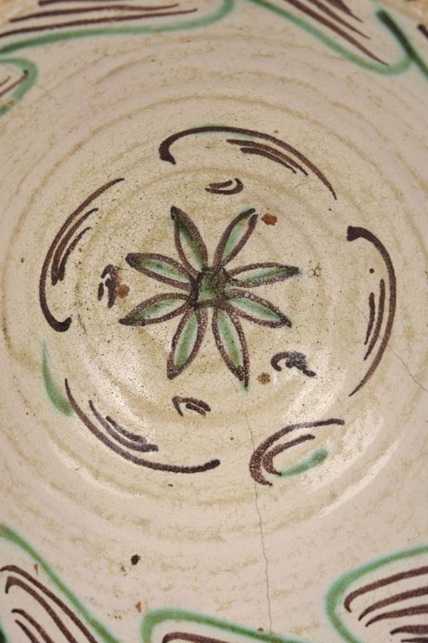 Grande catino in maiolica policroma dipinta con fiore al centro del cavetto e bordo evidenziato a decori geometrici verdi e bruni.