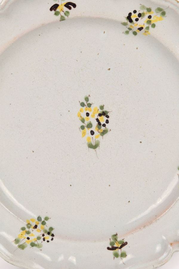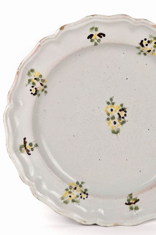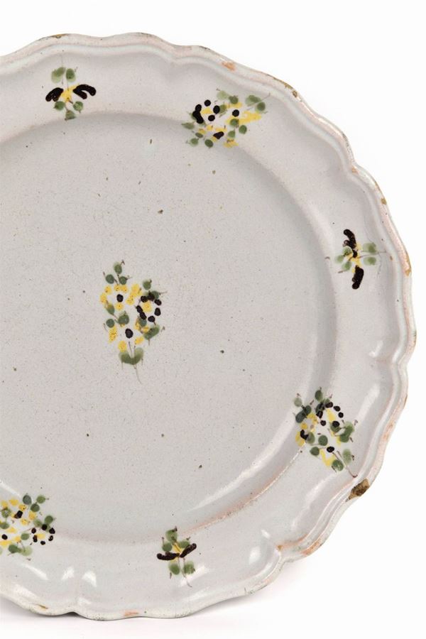 Grande piatto in maiolica policroma dipinta a piccoli fiori nei colori del giallo, verde e bruno, bordo sbacellato.