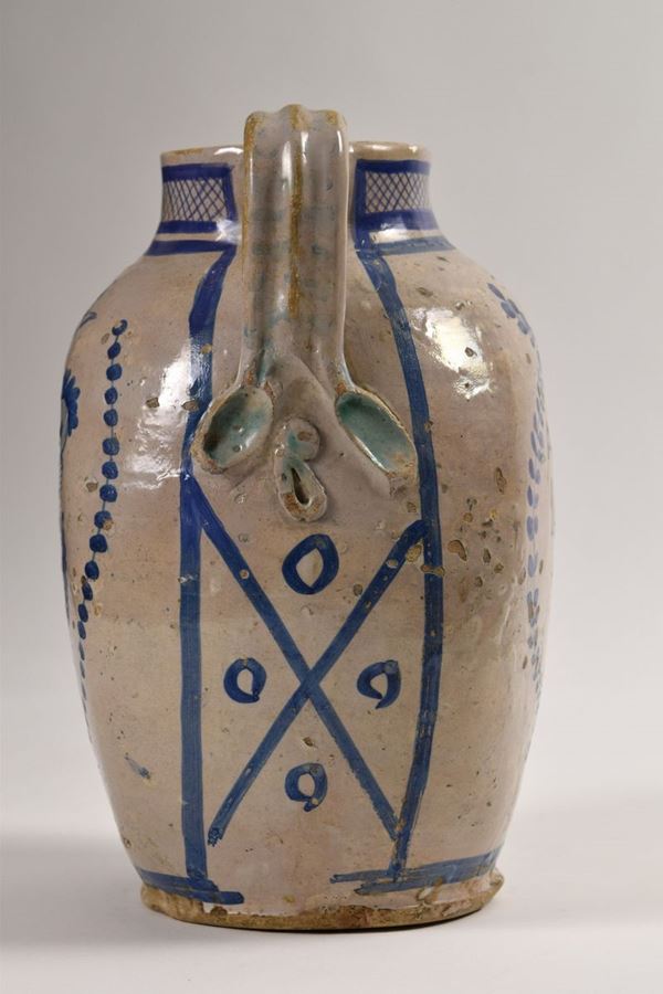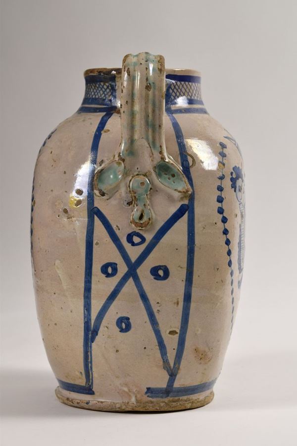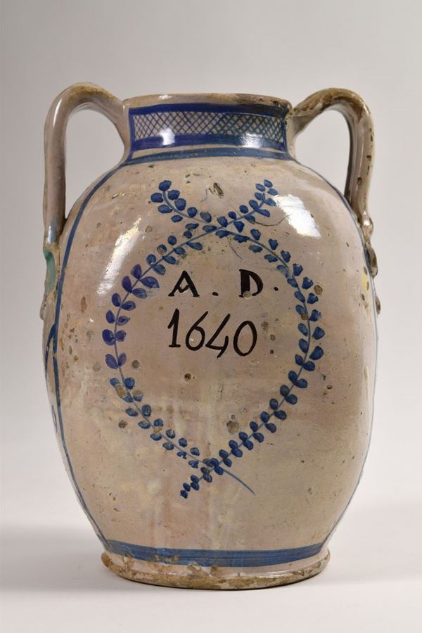 Orciolo a due manici in terracotta smaltata ed invetriata dipinto in blu con stemma nobiliare sul fronte, nel retro datato 1640 e ghirlanda di fiori.