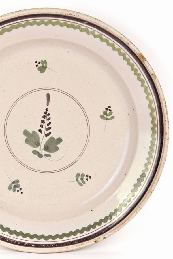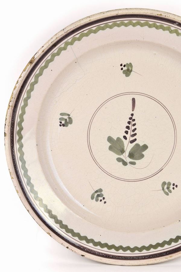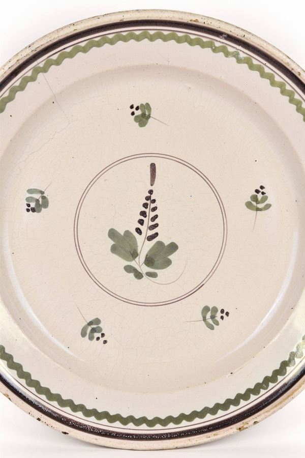 Piatto in maiolica policroma con fiore al centro, piccoli fiori a contorno e tesa decorata a motivi geometrici in verde e bruno.