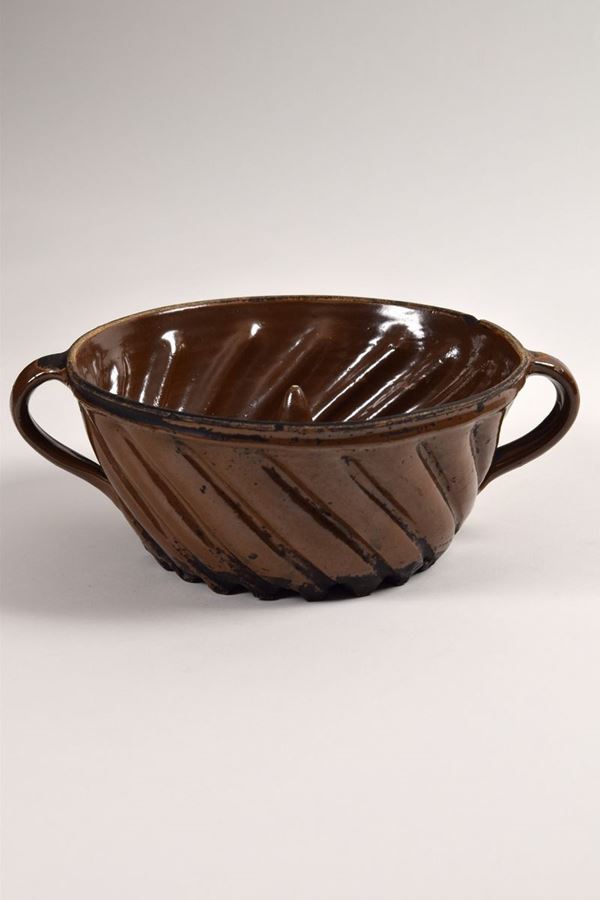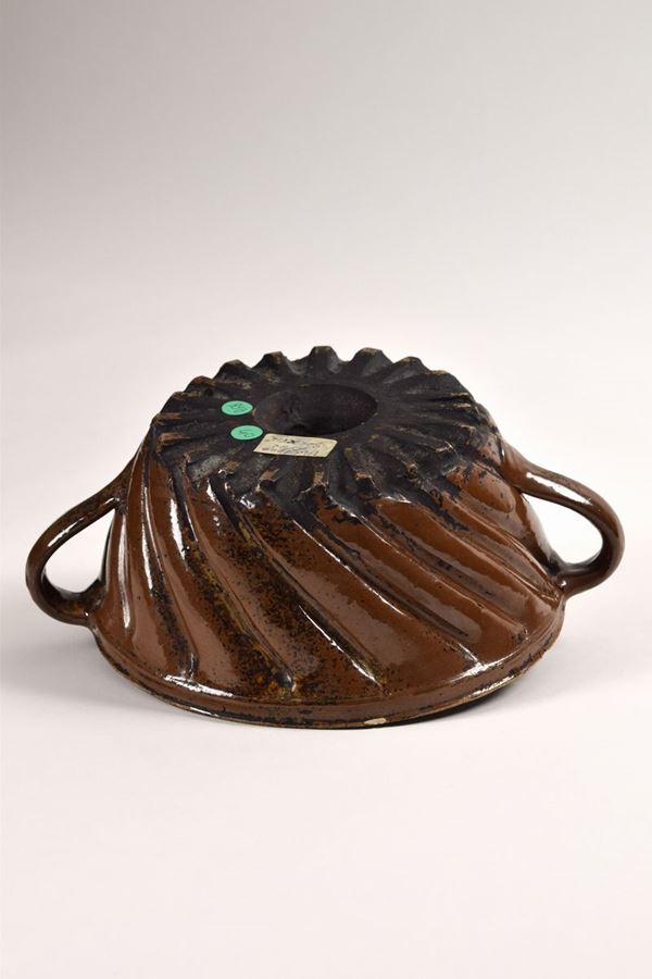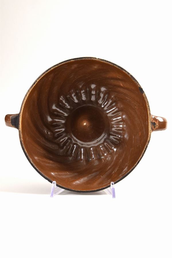 Stampo da dolce a due manici in terracotta smaltata ed invetriata in marrone.