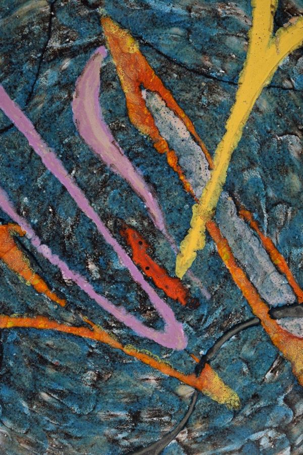 Grande ciotola in ceramica policroma a fondo verde con motivi informali.