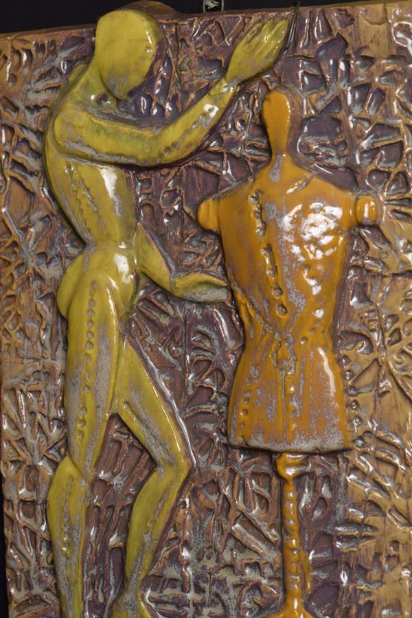 Piastra in ceramica policroma con manichini sartoriali a bassorilievo eseguito come pubblicità per la Drapers, ingrosso di tessuti bolognese.