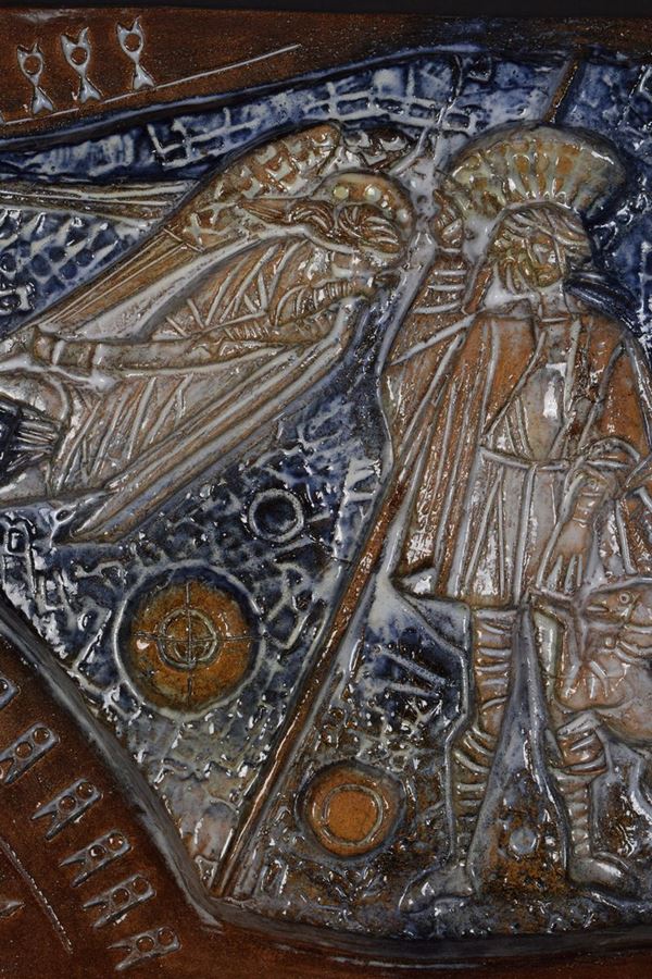 Pannello in ceramica policroma raffigurante San Rocco con i simboli iconografici del Santo come il bastone e il cane e un angelo.
