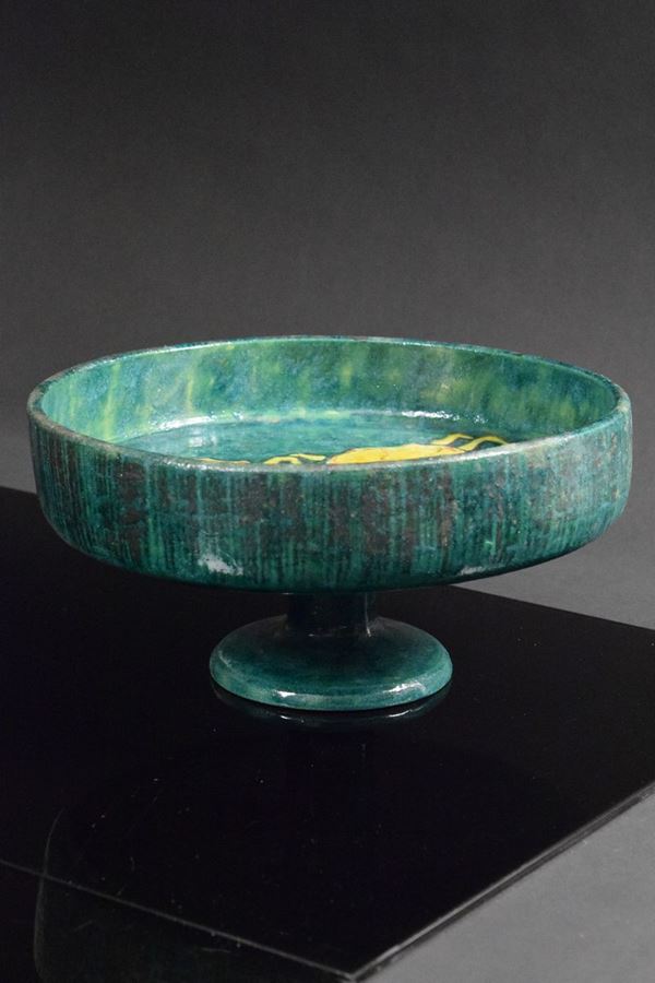 Alzata in ceramica policroma con colature nere sul bordo esterno, al centro tre granchi.