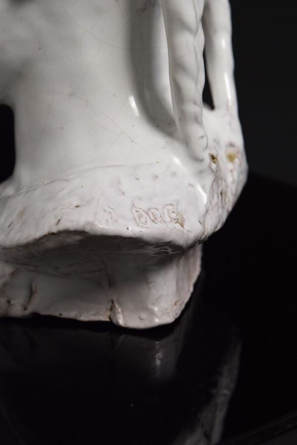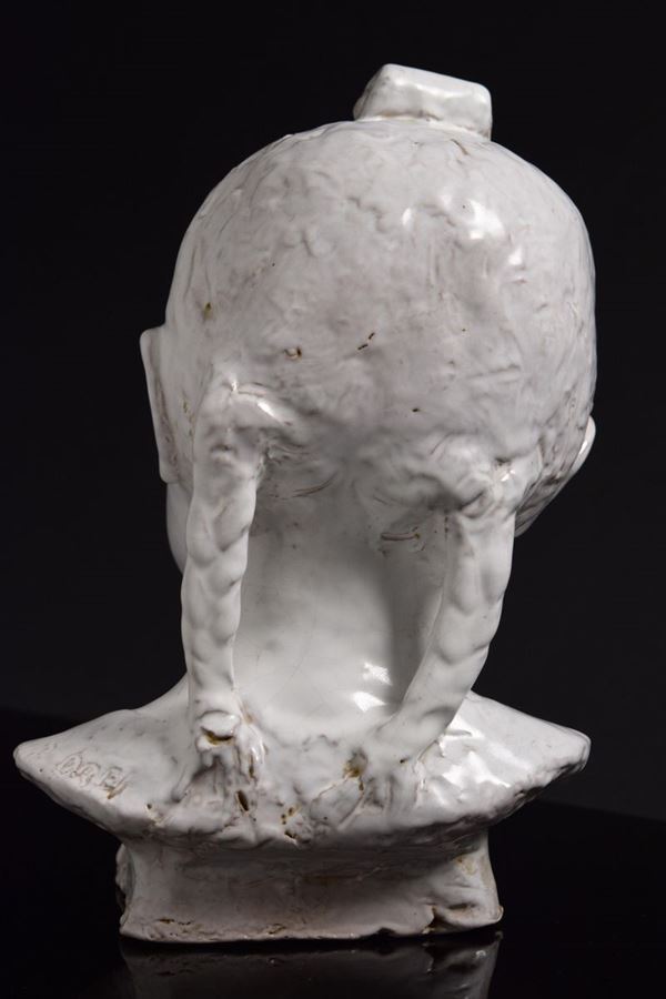 Testa di bimba cinese con treccine in ceramica monocroma a smalto in bianco. Da un bozzetto del 1927