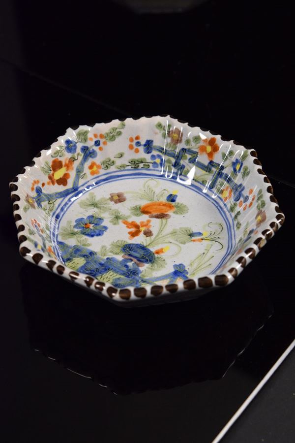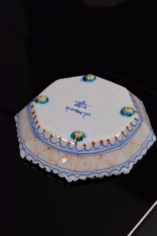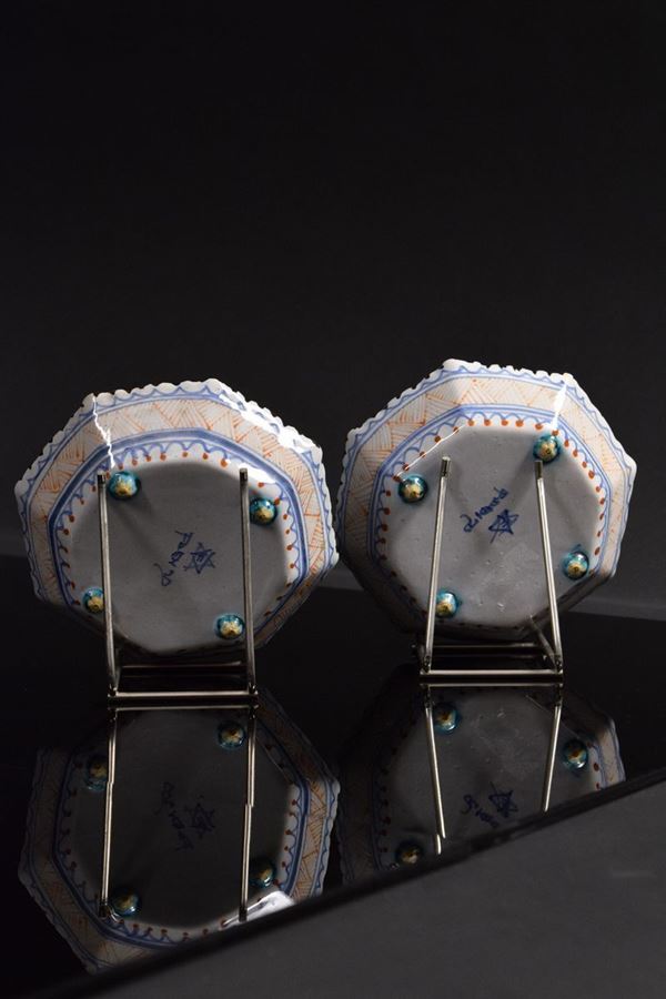Coppia di ciotole ottagonali in ceramica policroma con decoro a "garofano", bordo evidenziato da tratteggio nero. Sotto la base presenti piccoli piedini evidenziati da colore verde rame.