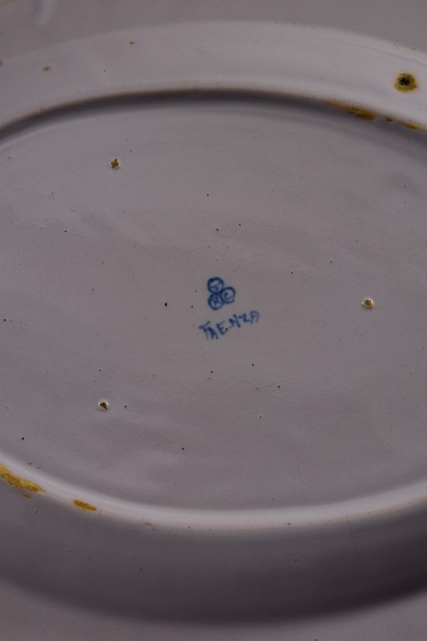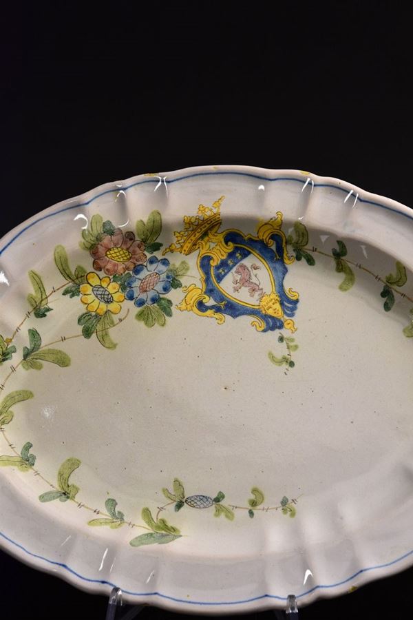 Vassoio in ceramica policroma dipinta a tesa modanata, decorato con fiori e fogliame e stemma della Città di Faenza.