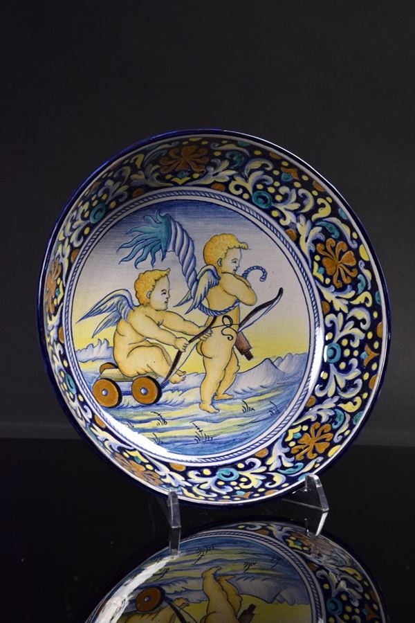 Ciotola in ceramica policroma con tesa decorata a motivi floreali con al centro due putti giocosi.