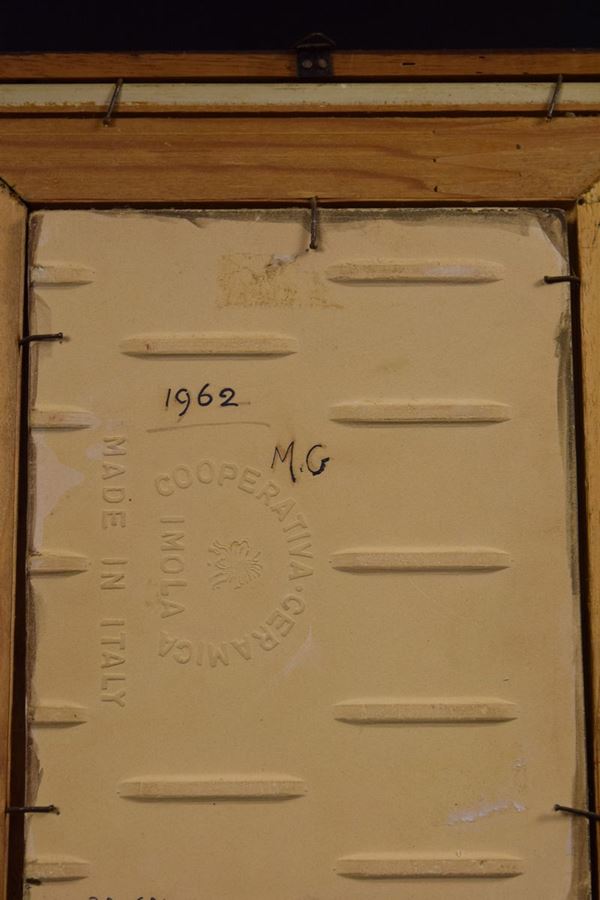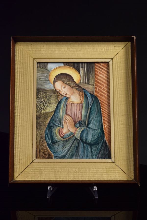 Piastrella della Cooperativa Ceramica Imola, in ceramica dipinta con soggetto Madonna in preghiera. Cornice coeva.