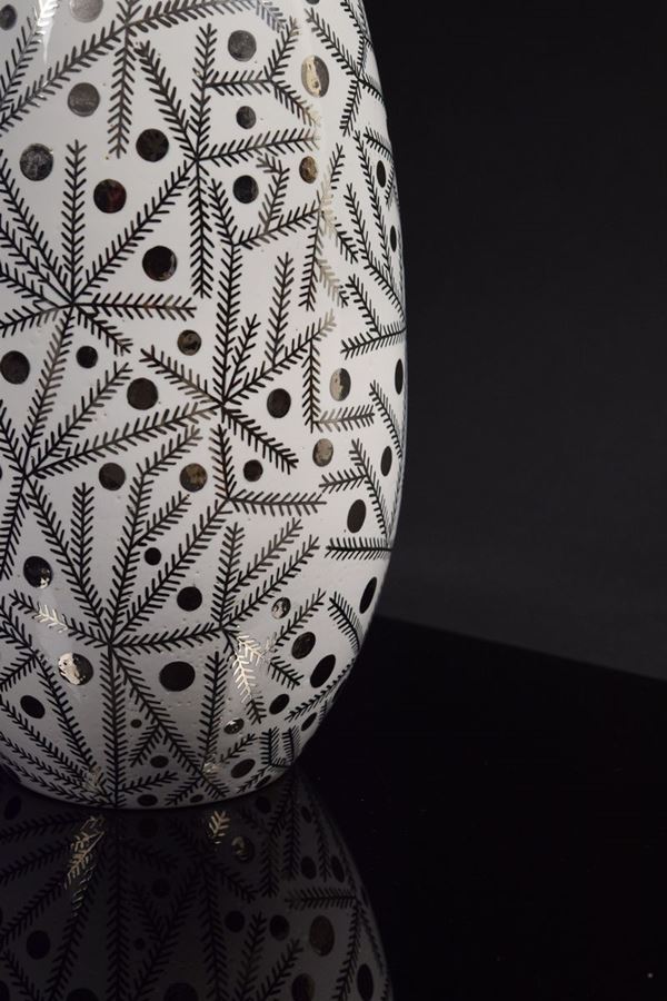 Vaso ovoidale in ceramica policroma a fondo chiaro con motivi in platino.