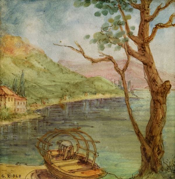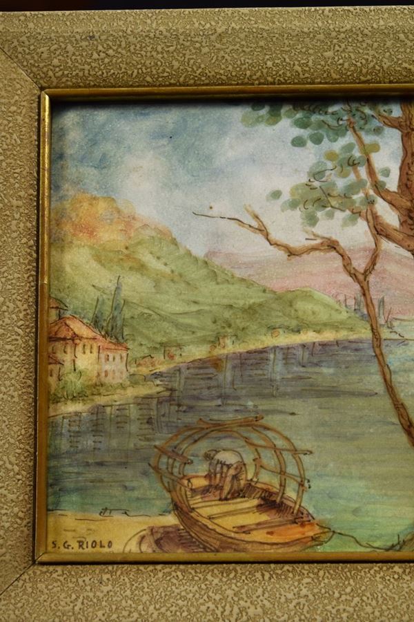 Piastrella in ceramica policroma dipinta con paesaggio lacustre. Cornice coeva.