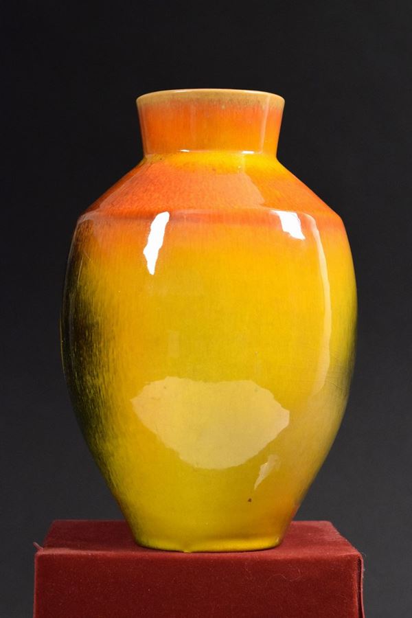 Vaso in ceramica policroma con decoro a fogliame a spruzzo.