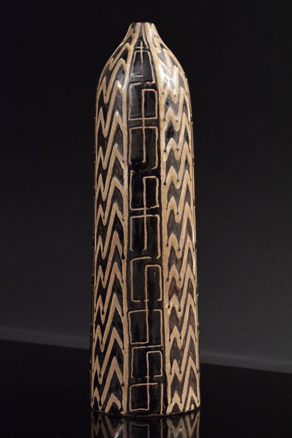 Vaso cilindrico in ceramica policroma decorato a motivi geometrici nei toni del marrone.