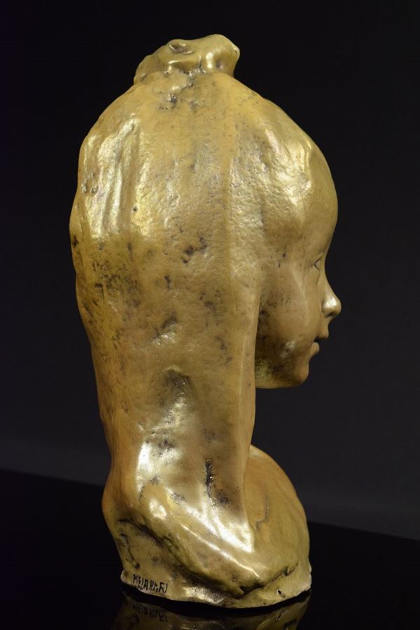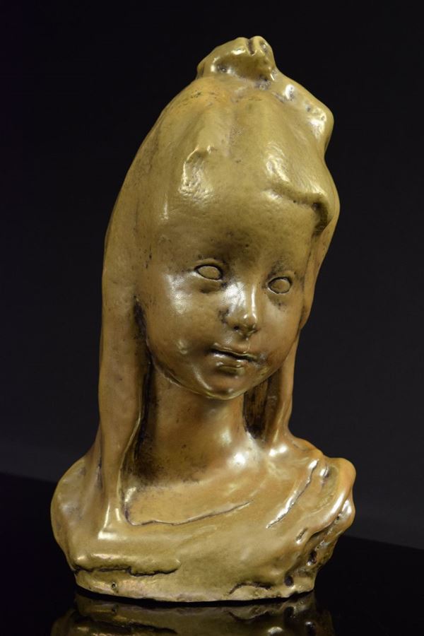 Testa di fanciulla in ceramica monocroma leggermente riflessata con lumeggiare in nero. Da un modello di Domenico Matteucci.
