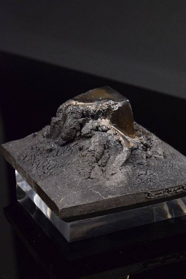Cubo in grès effetto bronzo immerso in grès lavico mat. Montato su base in plexiglass.