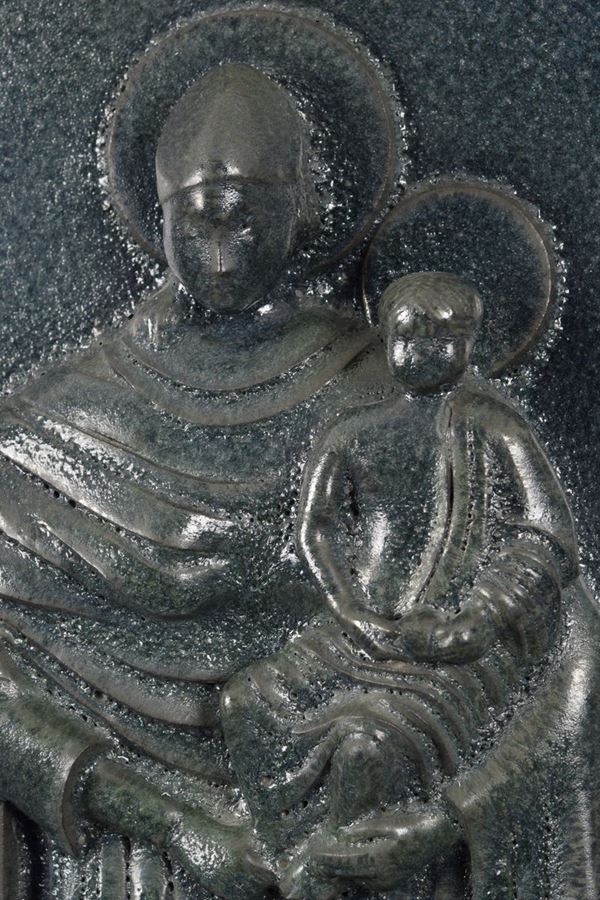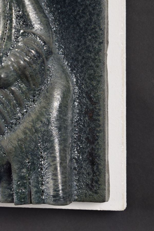 Pannello in grès monocromo di Madonna con Bambino ad altorilievo di colore verde scuro. Montato su pannello di faesite coevo.
