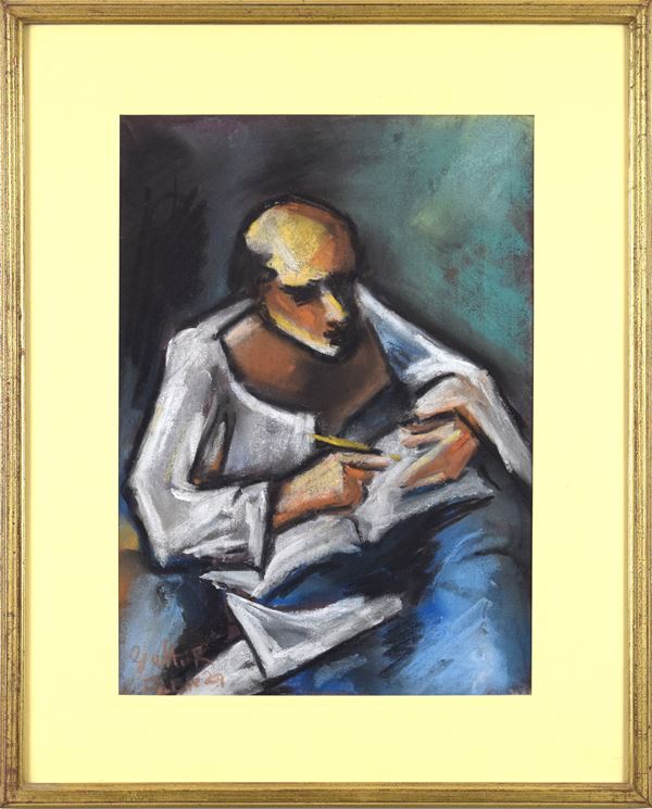 Tempera su cartoncino raffigurante autoritratto dell'autore.