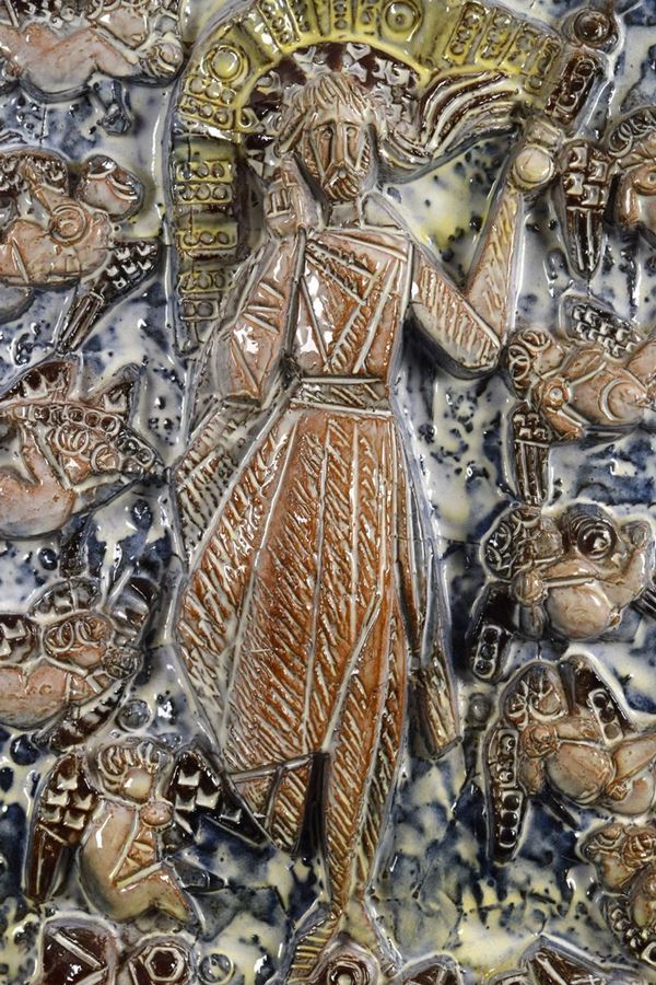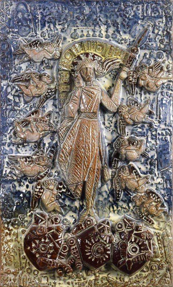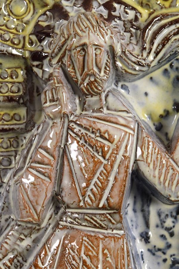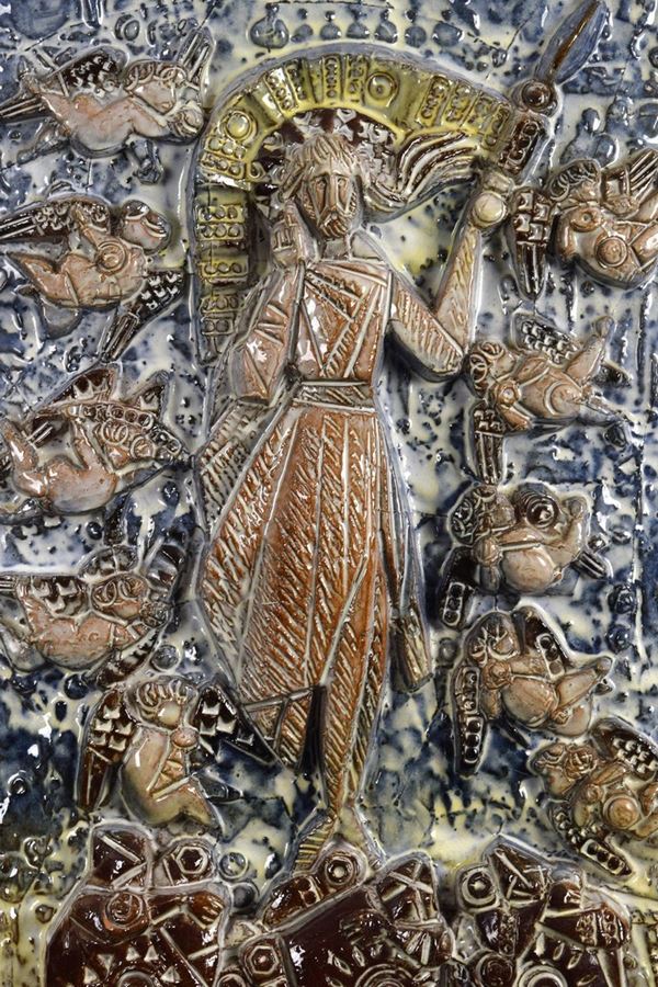 Pannello in ceramica policroma montata su legno a tema religioso.