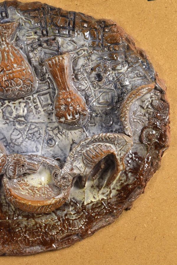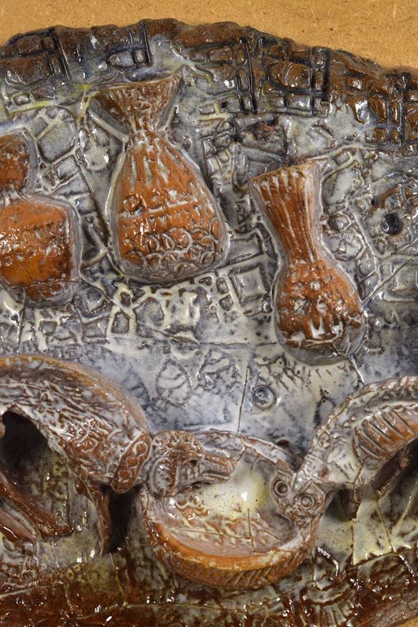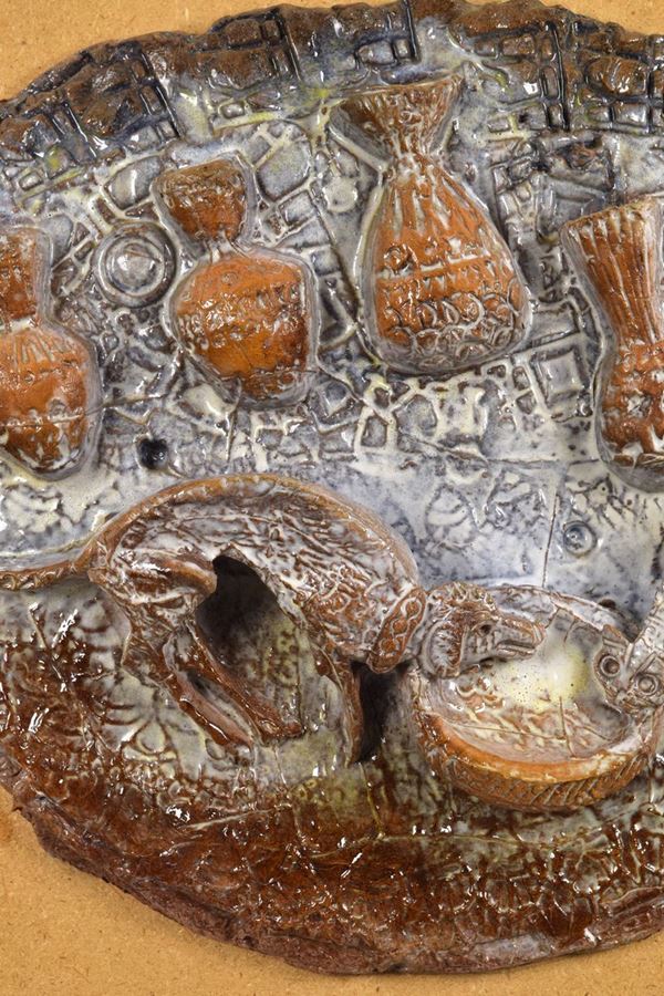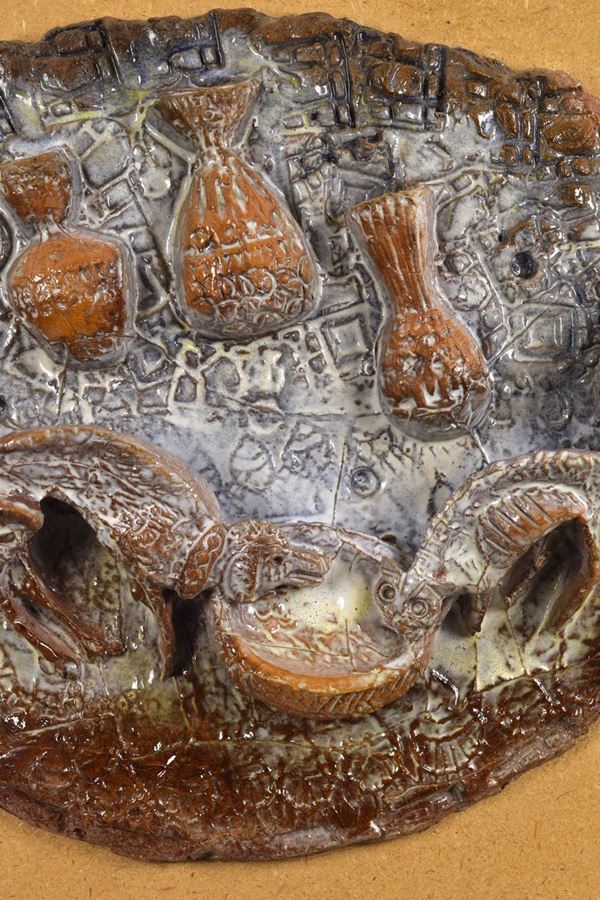 Pannello in ceramica policroma a bassorilievo raffigurante cane e gatto, montato su faesite.