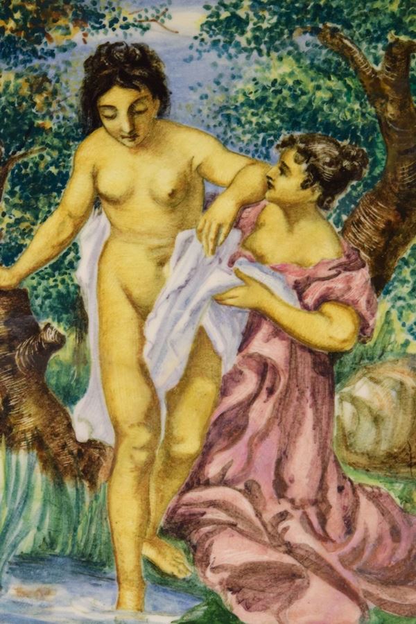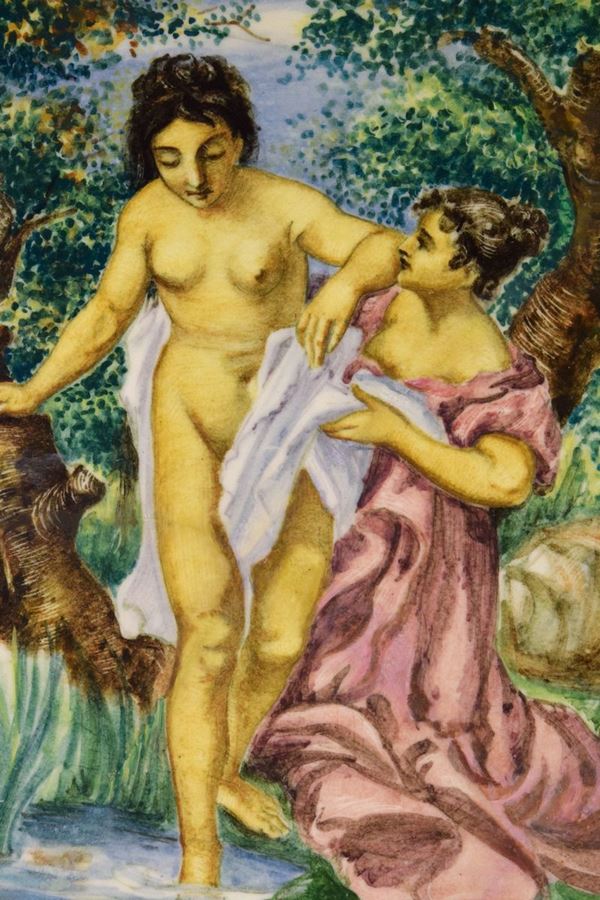 Tondo in maiolica policroma dipinta a mano con scena di bagnanti. Entro cornice in legno ebanizzata coeva.