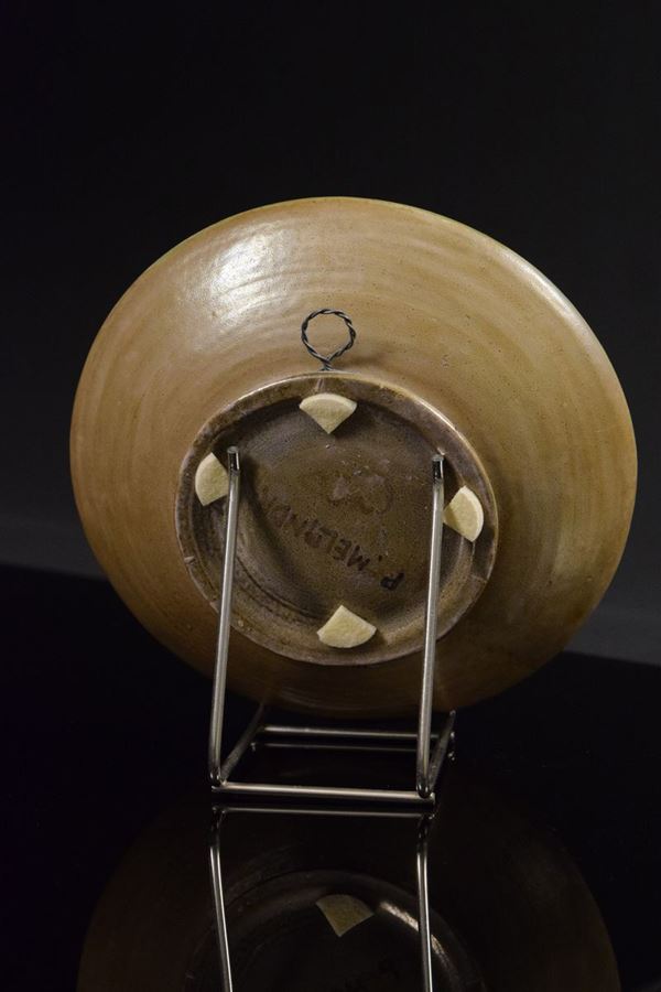 Ciotola in ceramica policroma con al centro fiori stilizzati a bassorilievo.