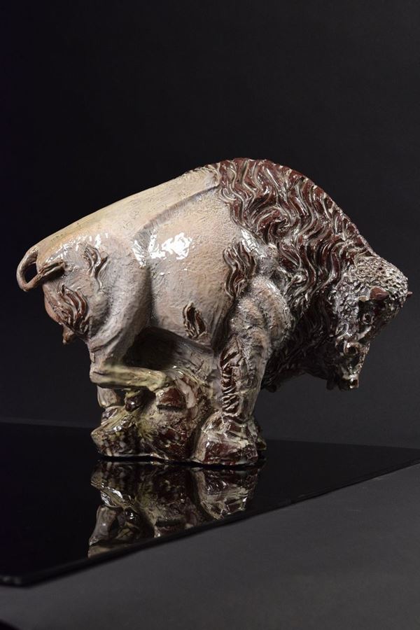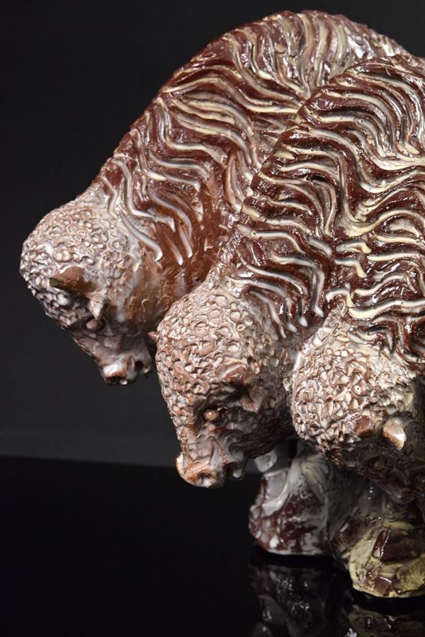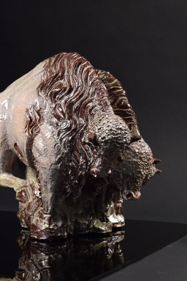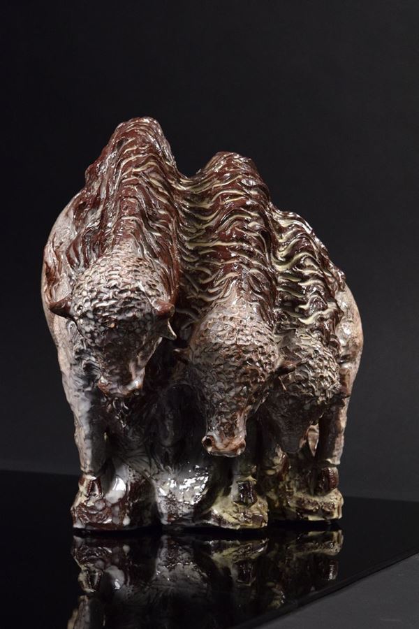 Modello a "tutto tondo" di mandria con tre bufali in ceramica policroma.