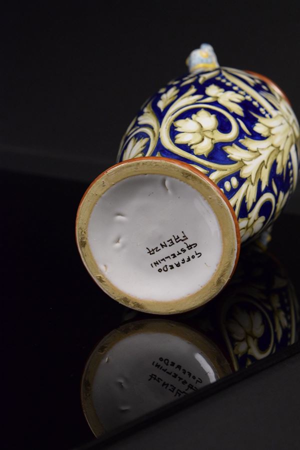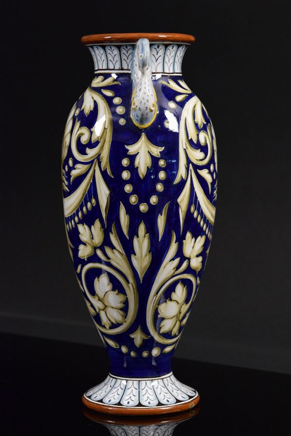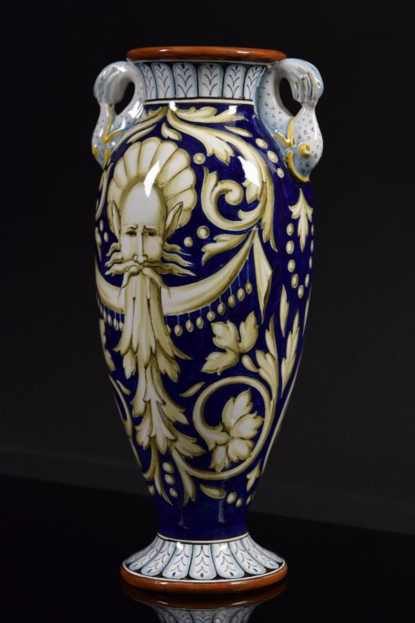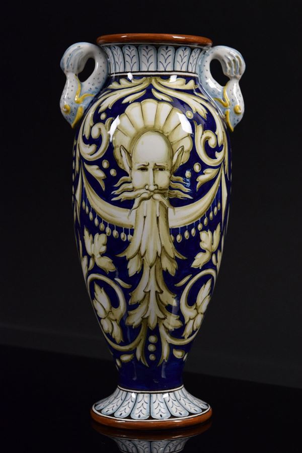 Vaso in ceramica policroma con due manici a forma di pesce, decorato a mascheroni a fondo blu.