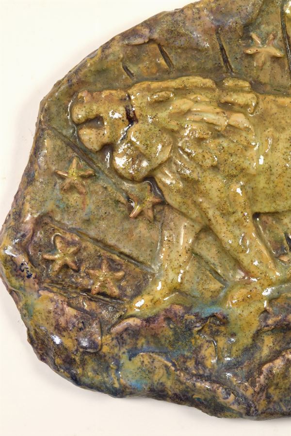 Pannellino irregolare in ceramica policroma con profilo di leone a bassorilievo.