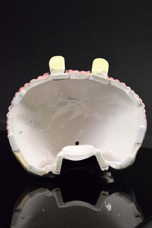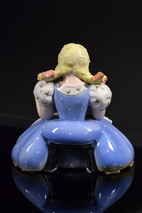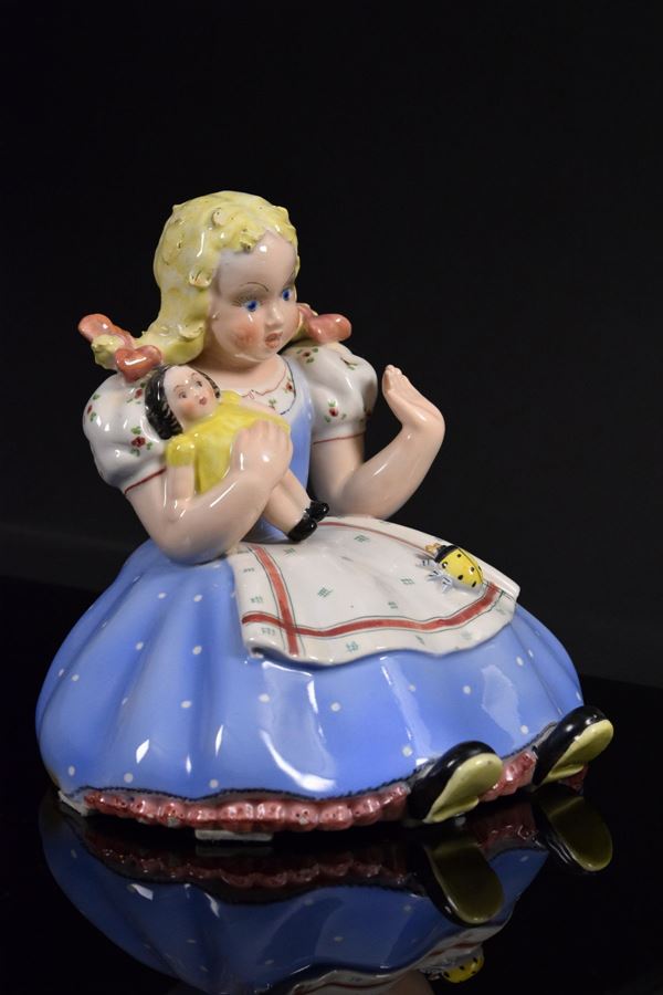 Bimba seduta con bambola spaventata da coccinella in terraglia a coraggio dipinta a mano, sotto vetrina.