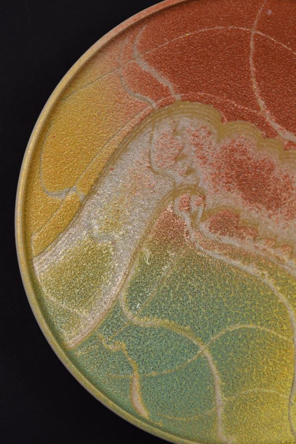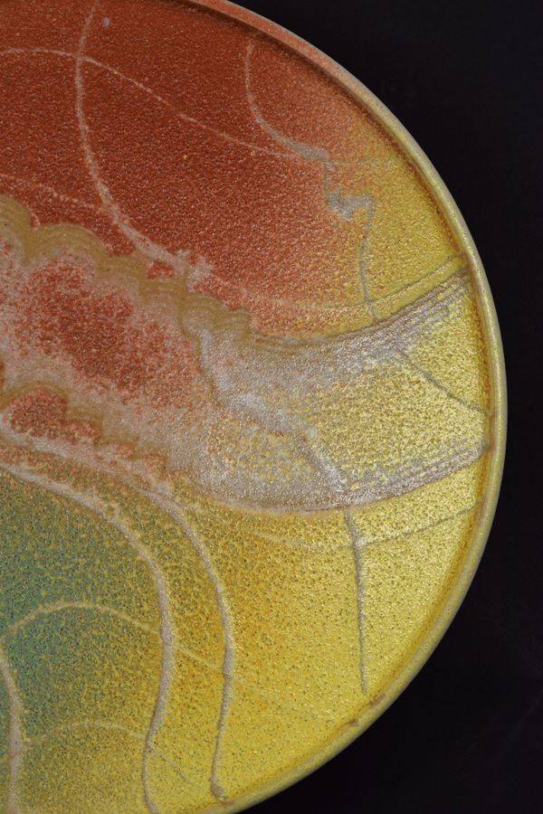 Grande ciotola in grès policromo decorato con motivi a forchetta.