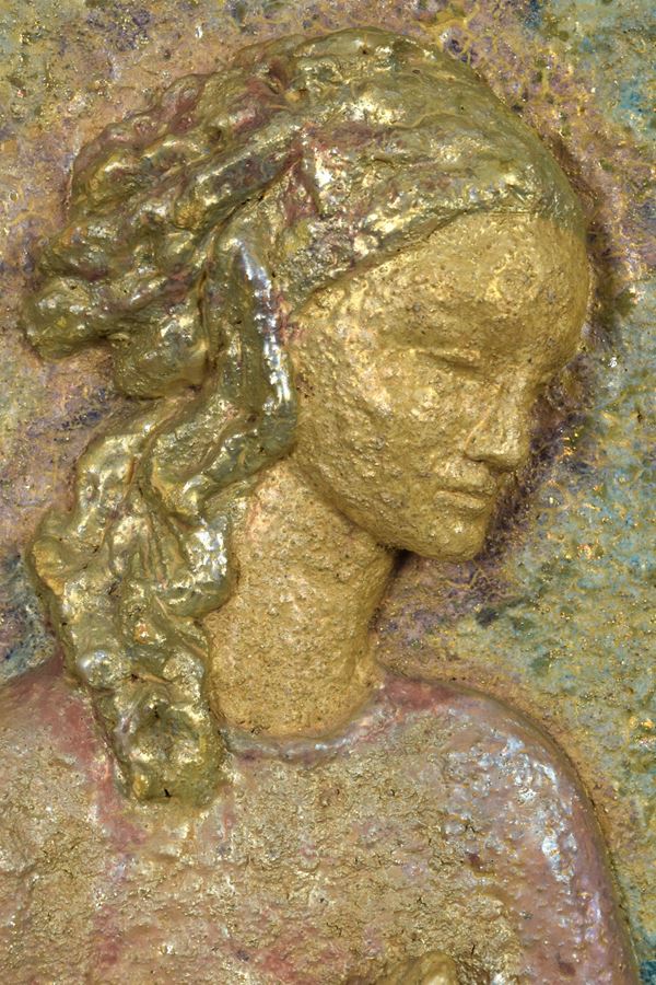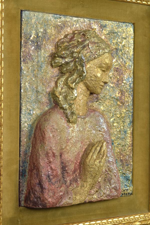 Bassorilievo di Madonna in ceramica policroma. Entro cornice coeva.