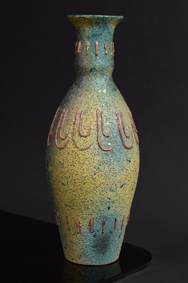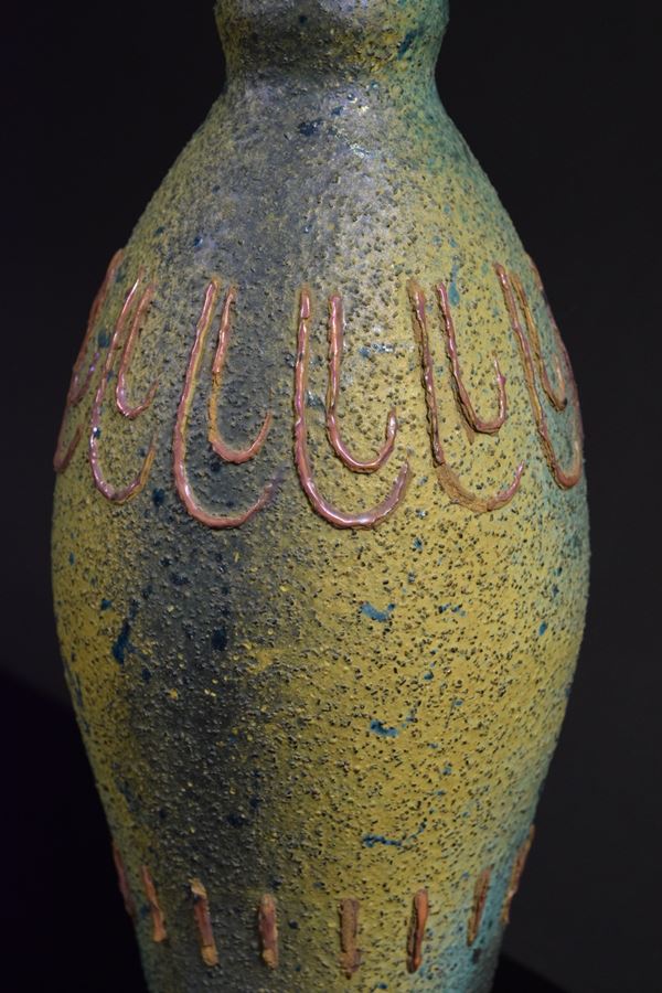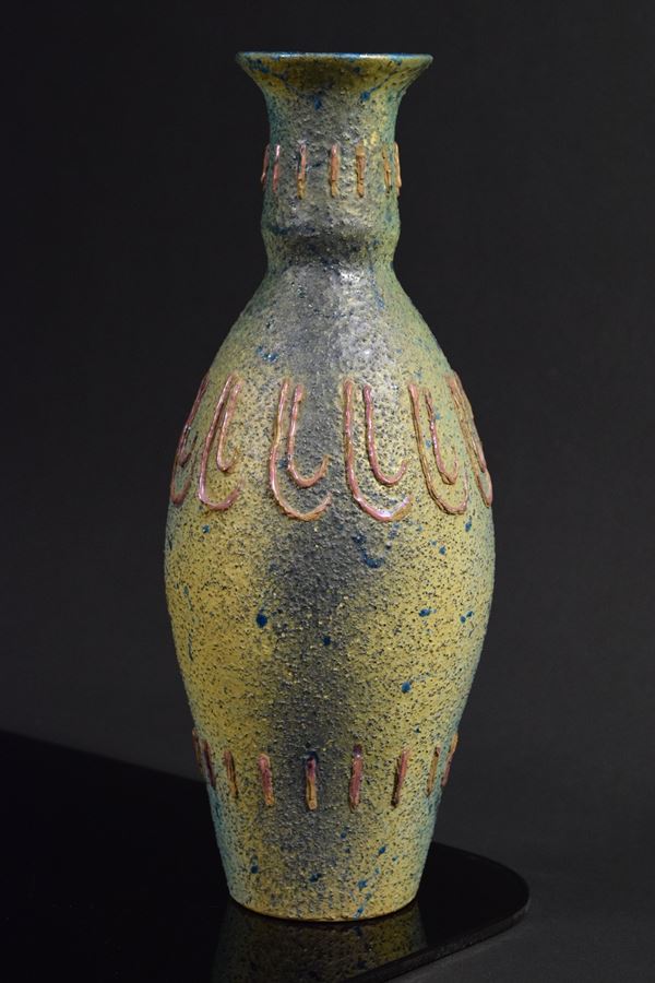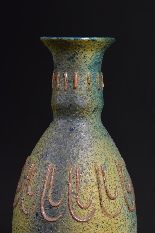 Vaso in ceramica policroma a smalto mat granuloso con decori a rilievo.