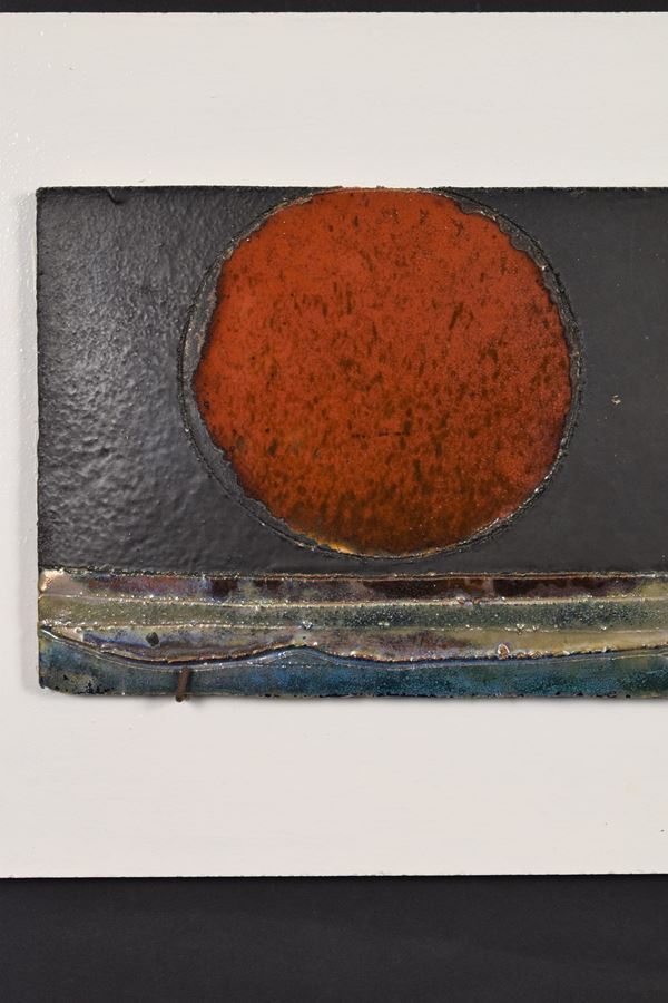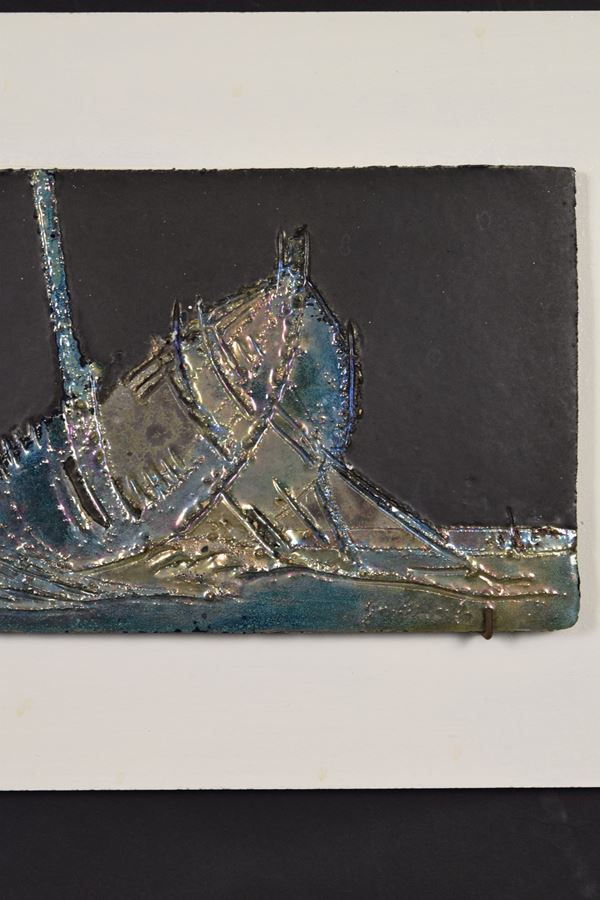 Pannello in ceramica policroma a sfondo mat e riflessato.