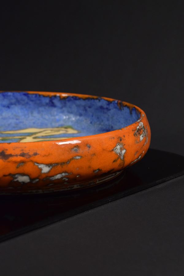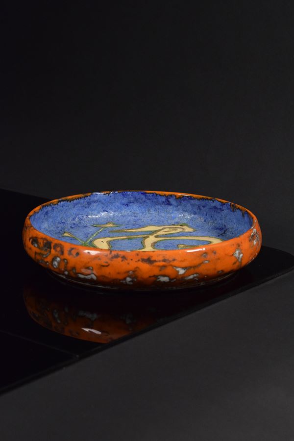 Ciotola in ceramica policroma con al centro figura stilizzata.