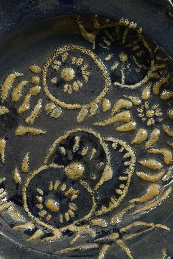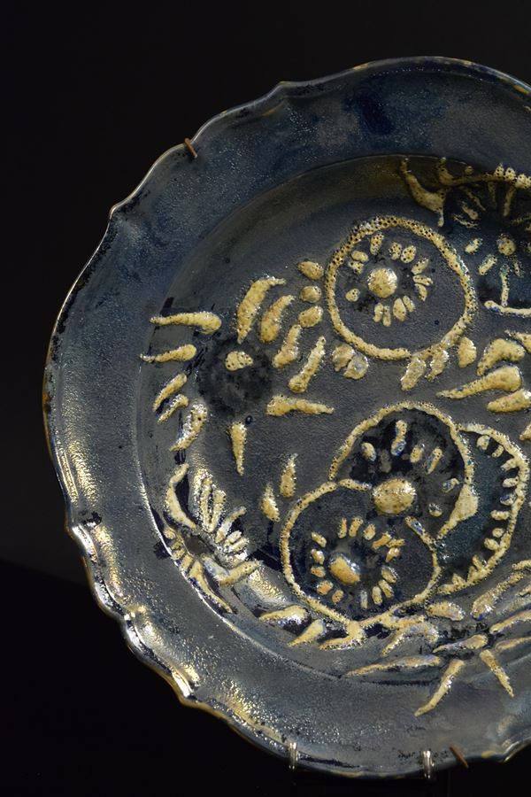 Piatto bacellato in ceramica policroma a lustro con fiori a rilievo chiari.