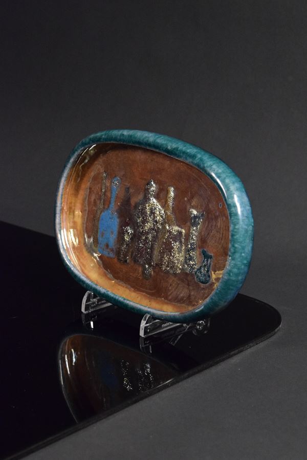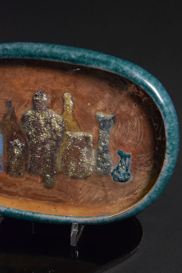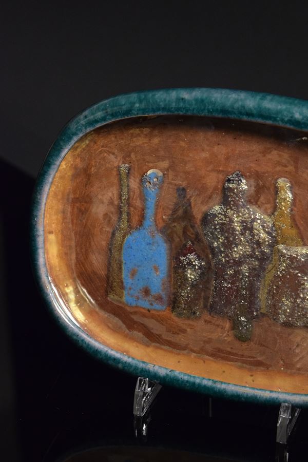 Ovale in ceramica policroma acidità a lustro con al centro natura morta di bottiglie in omaggio a Morandi.