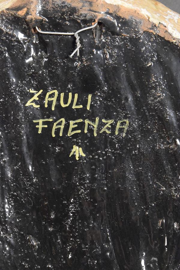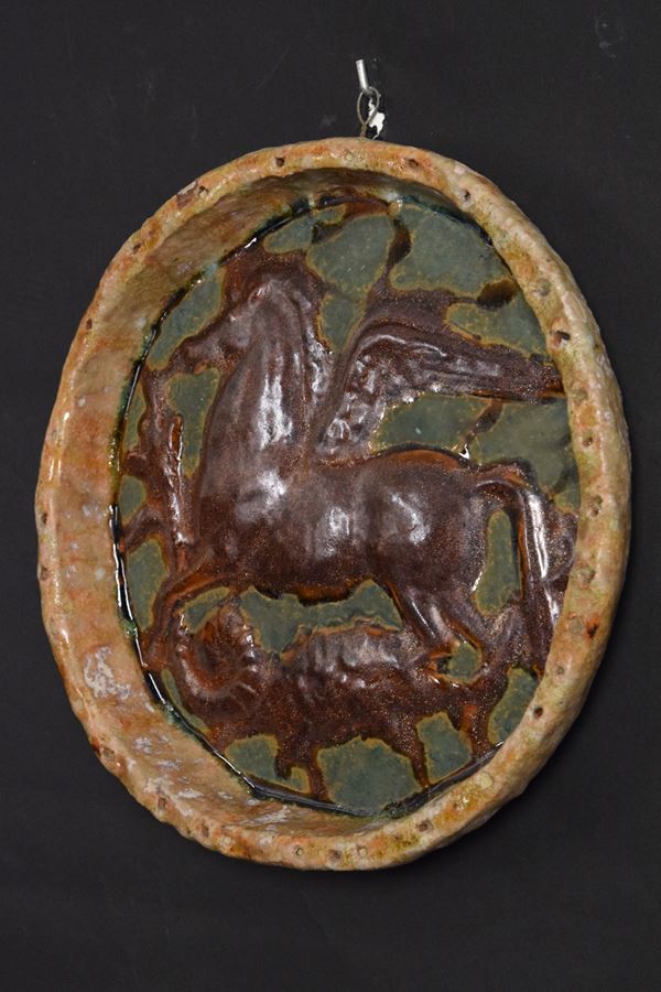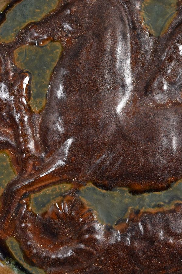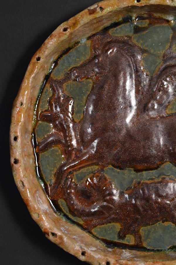 Tondo a bordi alti con callo alato al centro rifinito con la tecnica delle avventurine.