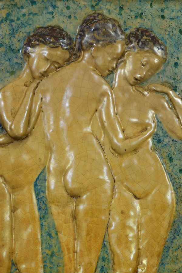 Pannello a rilievo in ceramica policroma smaltata opaco e a lustro raffiguranti "Le tre Grazie".
