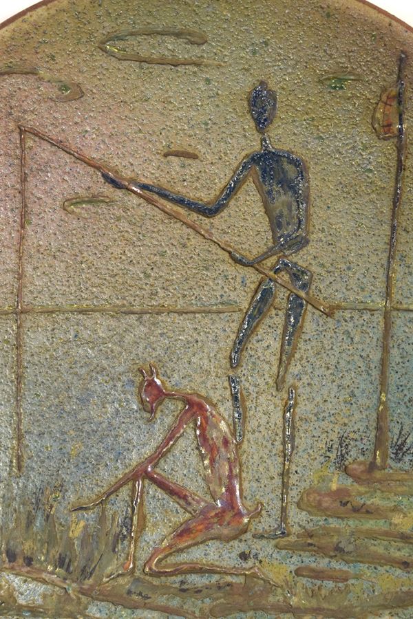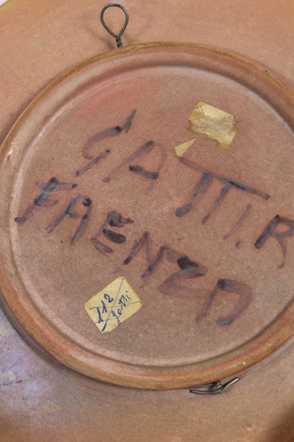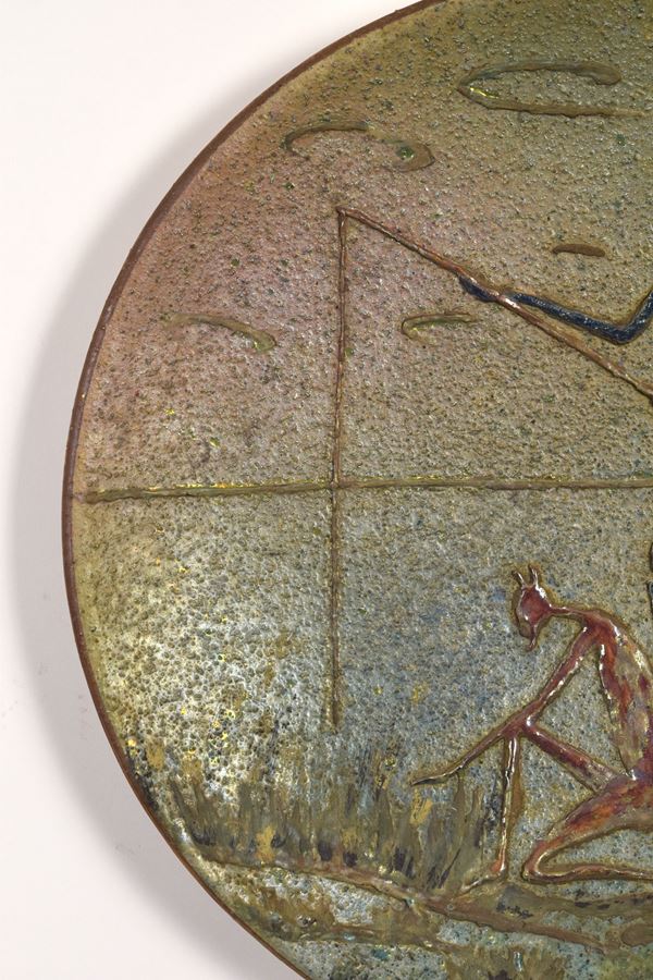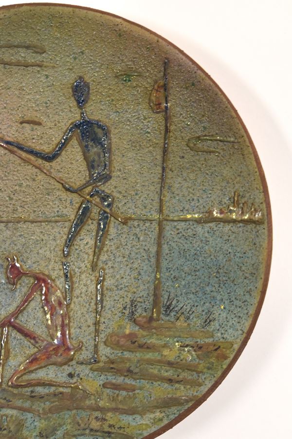 Piatto in ceramica policroma con figure stilizzate di pescatore e satiro a rilievo.